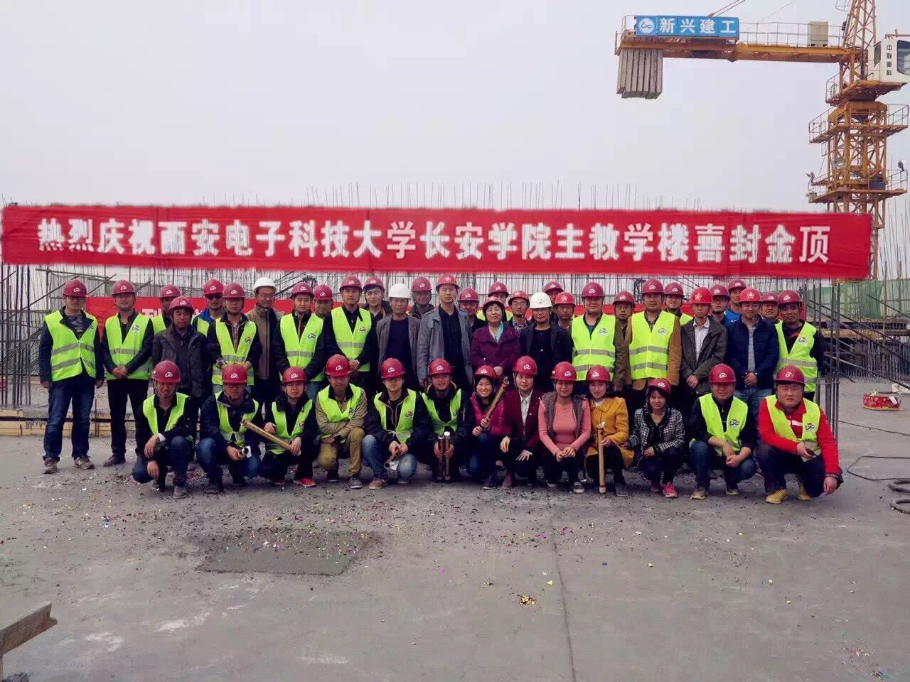 長安學(xué)院項(xiàng)目部建設(shè)指揮部全體人員、施工單位、設(shè)計(jì)單位、監(jiān)理單位全體參建人員一起參加了封頂儀式。