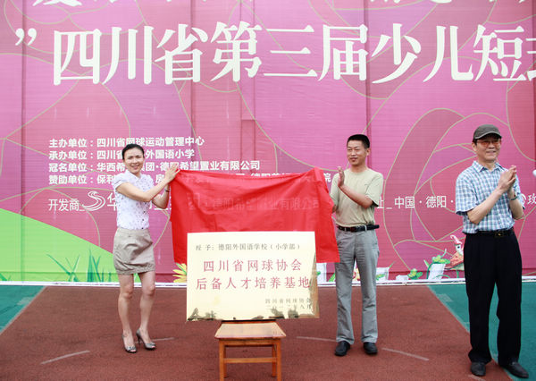 唐發(fā)初和顏昌平共同為德外小學(xué)“四川省網(wǎng)球協(xié)會(huì)后備人才培養(yǎng)基地”揭牌。